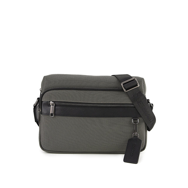 This functional messenger bag features a detachable metal plate logo, zip closure, front zip pockets, inner zip & slip pockets, and back zip pocket. The adjustable shoulder strap provides easy carrying. Constructed from durable nylon and leather, this bag is water-repellent.